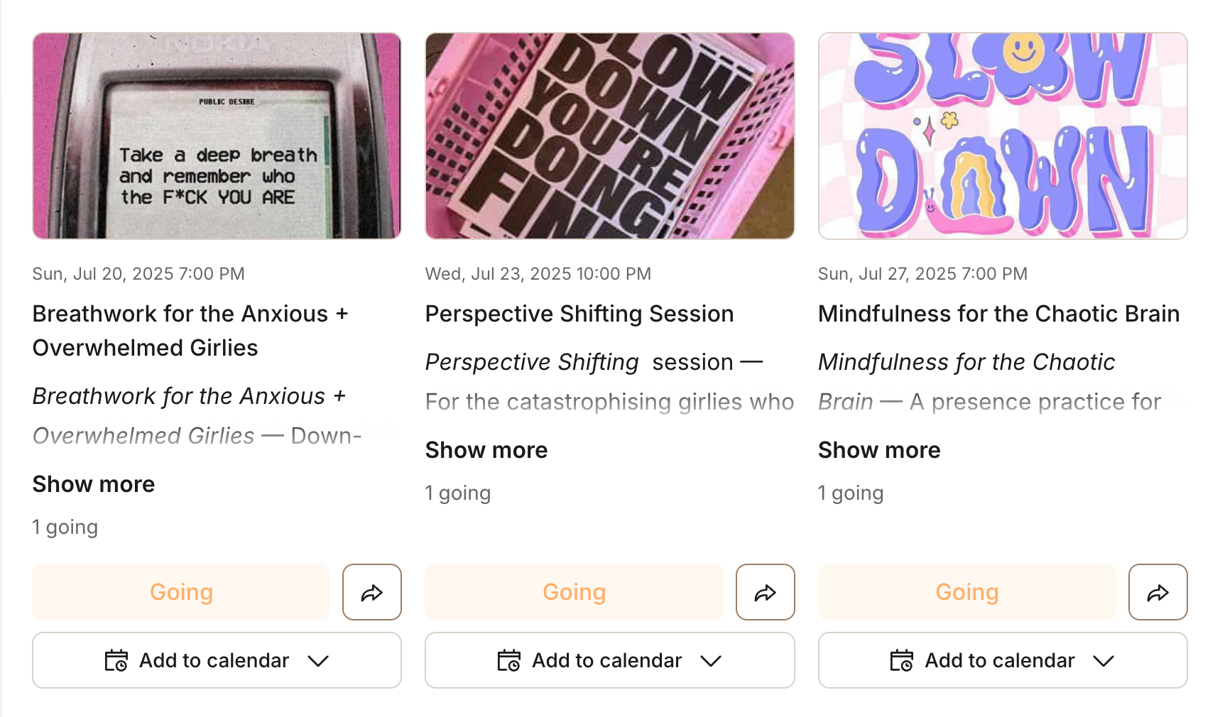 Every month inside the Unf*ck Your 30s Club, you’ll get direct access to live sessions with Becca — from Breathwork to workshops, Masterclasses to mindset resets. Whether it's a deep-dive mastermind, a grounding Breathwork session, or a guided Journaling journey, these live events are your chance to tune in, connect, and get real-time support from Becca herself. They’re practical, powerful, and packed with energy — because nothing beats doing the inner work together.
